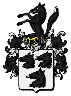 Blasonierung: „Im Schilde drei Wolfsköpfe 2:1 gestellt. Auf dem Helm ein wachsender Wolf.“