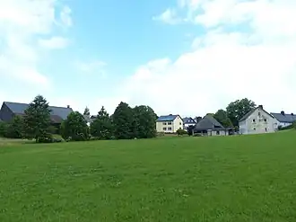 - Haus Nr. 9: Zweigeschossiger Wohnstallbau mit Halbwalmdach, der Scheitelstein der Wohnungstür bezeichnet „JND 1829“ (=Johann Nikol Dietel). Im Erdgeschoss Räume mit Segelgewölben.[10]