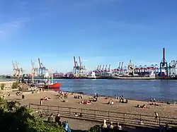 Zwischen Museumshafen und dem Elbstrand verläuft der Neue Elbtunnel, zu erkennen an einem Belüftungsbauwerk, dem Belüfterbauwerk Mitte.
