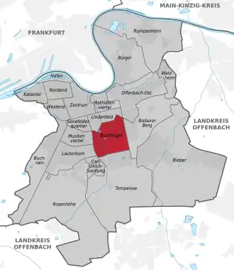 - ↑ Magistrat der Stadt Offenbach am Main – Vermessungsamt: Anlage zur Stadtteilsatzung – Karte. In: offenbach.de. 11. Juni 2019, abgerufen am 25. August 2019.