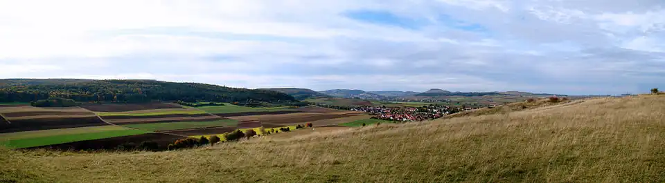 Panoramablick von den Ofnethöhlen aus auf den Ipf und die Stadt Bopfingen