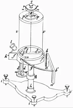In Bestimmung des Gesetzes, nach welchem Metalle die Contactelektricität leiten[10] beschrieb Ohm 1826 zunächst kritisch das „beständige Wogen der Kraft“ in seinen vorhergehenden Versuchen.[11] Es folgt die Beschreibung[12] einer von ihm entworfenen „Drehwaage“,[13] die er von einem Handwerker anfertigen ließ (siehe Abbildung). Das bügelförmige Bauelement ist ein Thermoelement aus einem Wismutbügel, an dessen Schenkeln jeweils ein Kupferstreifen befestigt ist. Ein Schenkel wurde mit siedendem Wasser erwärmt, der andere mit Eiswasser gekühlt. (Die Gefäße für die Temperaturbäder sind nicht dargestellt.) Ohm führte seine Experimente im Januar 1826 durch.