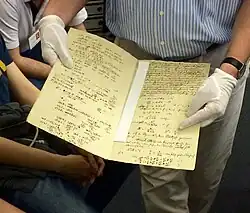 Ohm maß die auf die Magnetnadel wirkenden Kräfte, wenn er die Enden verschieden langer Drähte in die mit Quecksilber gefüllten „Eierbecher“ und tauchte. In einem Laborbuch hielt er die auf diese Weise gewonnenen Messdaten fest und entwickelte in diesem Laborbuch auch die Formel (siehe Foto, linke Gleichung). Hierbei steht für den elektrischen Strom, für die „erregende Kraft“, steht für den Leitungswiderstand der Drehwaage (inklusive Spannungsquelle) und für die Länge der benutzten Drähte. Die rechte Gleichung auf dem Foto beschreibt die Zusammenhänge zwischen elektrischem Strom , „erregender Kraft“ und Leitungswiderstand der Drehwaage bei einer Drahtlänge von , also im Falle eines elektrischen Kurzschlusses. In einem weiteren Artikel desselben Jahres[16] benutzte Ohm den Begriff „elektrische Spannung“ statt „erregende Kraft“.