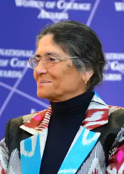 Since the Tajik Civil War ended in 1997, Oinikhol Bobonazarova has worked tirelessly to draw attention to women’s rights, torture and detention centers, and the plight of Tajik migrant laborers. In September 2013, Ms. Bobonazarova became the first-ever female candidate for president of Tajikistan when the only Islamic political party in central Asia nominated her as its standard bearer. Despite an unsuccessful bid, her nomination shattered one of the highest of glass ceilings and set an important precedent for women in politics. In the time since, she has continued to speak out against torture and has been instrumental in working to establish the first independent prison-monitoring program since prisons were closed to outside access in 2004. For fearlessly advocating the rights of women and labor migrants and fighting to end torture in Tajik detention centers, we name Oinikhol Bobonazarova a Woman of Courage.[10]