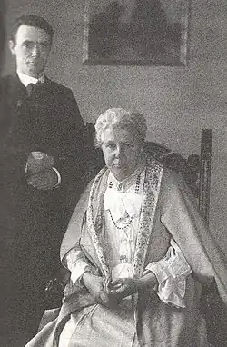 Aus der Beschäftigung mit dem Spiritismus ging die 1875 unter der Leitung von Henry Steel Olcott und Helena Petrovna Blavatsky in New York gegründete Theosophische Gesellschaft hervor, zu deren Zielen die Erforschung okkulter Phänomene und Kräfte sowie vergleichende Studien der Religionen, der Philosophien und der Naturwissenschaft gehören, um darin verborgene „Wahrheiten“ aufzudecken.[31][32] In den folgenden Jahren entwickelte Blavatsky eine synkretistische esoterische Lehre, die moderne Theosophie, welche eine Einweihung in okkulte Geheimnisse verspricht und Elemente der Gnosis, der Hermetik und anderer Traditionen der westlichen Esoterik mit solchen östlicher Religionen verbindet.[33] Sie fand begeisterte Anhänger in den Vereinigten Staaten, in Europa und in Indien, wo die Theosophische Gesellschaft zeitweilig ihren Hauptsitz hatte.