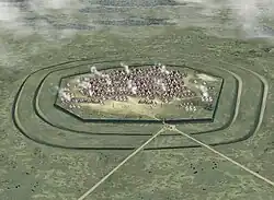 Der Interpretation der Ausgräber zufolge, kamen die ersten Siedler möglicherweise aus dem nördlich anschließenden Bosnatal. Die Gründung der Siedlung fand dabei auf einer bereits durch Viehdrift geöffneten Flussterrasse statt. Bereits in dieser frühen Phase wird die Siedlung von einem ca. 1,30 m tiefen und 4,5 m breiten Graben eingefasst, was auf eine planmäßige Anlage des Dorfes hindeutet. In der Phase nach etwa 5150 bestehen vermutlich drei Gräben parallel, deren Ausmaße von ca. 25 m Breite und mindestens 1 m Tiefe einzelner Gräben als fortifikatorisches Hindernis interpretiert werden. Berechnungen zufolge wurden dadurch zunächst 250–325 Hausstellen, später ca. 500–650 Hausstellen geschützt. Die Einwohnerzahl der Siedlung wird zu Anfang auf 500–1500, später auf 2000–3000 geschätzt.[5]