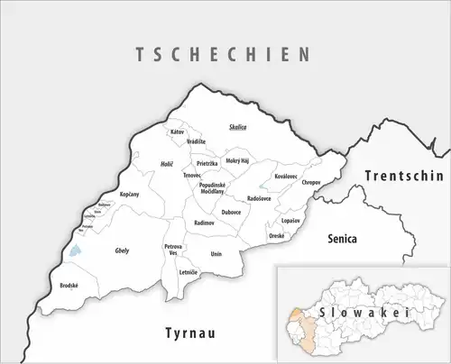 Der Bezirk liegt westlich der Ausläufer der Weißen Karpaten und endet im Westen an der March. Er grenzt im Norden und Westen an Tschechien (genauer an den Okres Hodonín), im Osten an den Okres Myjava im Trenčiansky kraj sowie im Süden an den Okres Senica.