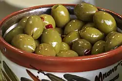Die Farbbezeichnung „Oliv“ stammt vom lateinischen Begriff oliva, der sowohl den Olivenbaum als auch dessen Frucht, die Olive, bezeichnet. Sie ist an die Farbe unreifer, d. h. grüner Oliven angelehnt.