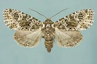 Die Flügelspannweite der Falter beträgt 39 bis 46 Millimeter.[1] Die Grundfärbung der Vorderflügeloberseite variiert von graubraun bis zu olivbraun. Das Mittelfeld ist etwas verdunkelt, die Submarginalregion leicht aufgehellt. Ring- und Nierenmakel sind weißlich gefüllt und dunkel gekernt. Die Querlinien sind weiß. Die Oberseiten der Hinterflügel haben bei den Männchen eine weißliche, bei den Weibchen eine hell braungraue Farbe.