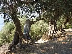 Die Geschichte des kultivierten Ölbaums reicht mindestens bis in die Bronzezeit zurück. Erste archäologische Funde von Olivenkernen sind über 9000 Jahre alt, dabei handelt es sich aber um von Menschen gesammelte Oliven von wilden Olivenbäumen. Als früher Beleg für das absichtsvolle Pflanzen von Olivenbäumen wurden Holzfunde aus Tel Tsaf im Jordantal interpretiert, die 7000 Jahre alt sind.[37] Wann die Wildform zur fruchtbaren Gartenolive kultiviert wurde, ist unbekannt. Archäologische Funde deuten jedoch darauf hin, dass dies um 4000 v. Chr. in Kreta und Syrien geschah. Auf kretischen Schrifttäfelchen und später auf mykenischenLinear B-Archivtafeln sind Oliven und besonders Olivenöl ein wichtiges Gut der Palastwirtschaft.