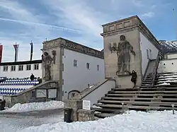 Das hufeisenförmige Olympia-Skistadion ist gen Südosten zu den vier Schanzen hin geöffnet. In der Mitte auf der Gegenüberseite befindet sich der Gasthof Olympiahaus.[14] Die Tribünen sind zumeist Steinbänke, auf denen man sowohl sitzen als auch stehen kann. Nur östlich des Olympiahauses wurden zusätzlich Holzbänke installiert. Je nach Saison sind im Stadion zudem Sitzschalen installiert.