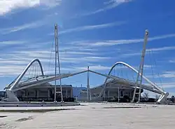 Es wurde jeweils ein Bogen im Westen und im Osten errichtet, wobei der westliche Bogen eine Spannweite von 304 Metern und eine maximale Höhe von 72 Metern hat.[8] Sie liegen 80 Meter voneinander entfernt und sind dreieinhalb Meter dick.[6] Der östliche Bogen wurde 65 Meter von seiner letztendlichen Positionierung montiert und der westliche 72 Meter entfernt. Nach der Fertigstellung mussten die Bögen in die richtige Position geschoben werden.[8] Dabei wurde erst der westliche, dann der östliche Bogen befestigt, nachdem zuvor das Stadiondach komplett angebracht worden war.[21] Das aus 5.000 Polycarbonat-Platten gebaute Dach hat ein Gewicht von rund 19.000 Tonnen und überdacht 25.000 Quadratmeter.[8] Allein die Renovierungskosten des Stadions für die Olympischen Spiele betrugen laut offiziellen Angaben 156 Millionen Euro,[4] nach Angaben des IOC-Präsidenten Jacques Rogge sogar 191 Millionen Euro.[22] Ursprünglich wurden die Kosten des Umbaus auf 80 Millionen Euro geschätzt.[14]