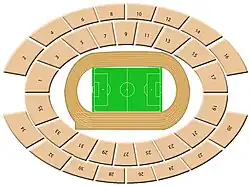 Vom europäischen Fußballverband UEFA wird das Stadion in der höchsten Kategorie (Kategorie 4 beziehungsweise bis 2010 Elitestadion) klassifiziert.[13] Die oval angelegte Spielstätte kann durch 34 Eingangstore betreten werden. Dabei führen die Eingangstore mit ungeraden Nummern zu den unteren Plätzen und die mit geraden Nummern zu den oberen. Das Bauwerk hat jedoch keine Eingangstore mit den Nummern 18 und 36, da sich dort die Stadionanzeige befindet. Zusätzlich bietet die Stätte 16 V.I.P.-Logen.[8] Das Bauwerk hat eine Spielfläche von 105 mal 68 Meter Rasen, die von einer 400-Meter-Laufbahn umgeben ist.[2]