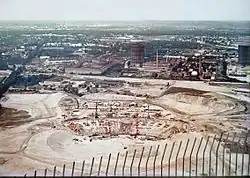 Um Platz für die Arena zu schaffen, musste zuvor das Terminalgebäude des alten Flugplatzes Oberwiesenfeld gesprengt werden.[34] Am 9. Juni 1969 begannen die Arbeiten für das Stadion, die Mehrzweck-Olympiahalle und die Schwimmhalle. Allerdings wurde erst am 14. Juli 1969 mit der Grundsteinlegung in einer symbolischen Feierstunde offiziell mit den Arbeiten begonnen.[35] Neben den drei Bauten entstanden auf dem Oberwiesenfeld zeitgleich die Werner-von-Linde-Halle, eine Volleyball-Halle, das Olympia-Radstadion, das olympische Dorf und diverse weitere Bauten wie Bahnhöfe für U- und S-Bahn.[36] Während der Bauarbeiten herrschte in München eine Aufbruchstimmung. Die Innenstadt erhielt zwischen Marienplatz und dem Stachus eine Fußgängerzone und die U-Bahn-Visionen wurden umgesetzt. Allein auf dem Oberwiesenfeld gab es 60 Baustellen. Von insgesamt 1,35 Milliarden Deutsche Mark an Olympiaausgaben flossen 137 Millionen in den Bau des Olympiastadions[36] und 170,6 Millionen in das Zeltdach.[37] Etwa 5.000 Bauarbeiter waren an der Baustelle tätig und arbeiteten zusammengerechnet mehr als eine Million Stunden.[20] Entgegen der Gewohnheit des deutschen Wiederaufbaus entstand das Olympiastadion weitgehend unter Verzicht auf vorgefertigte Teile.[38]
