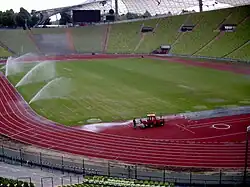 Das Olympiastadion ist ein Multifunktionsstadion, dessen Spielfeld von einer Rundlaufbahn umgeben wird, die eine Länge von 400 Metern hat und über acht Bahnen verfügt.[133] Die Laufbahn bestand ursprünglich aus Rekortan. Das Material wurde als gleichwertig mit dem üblicherweise verwendeten Tartan angesehen, wobei Rekortan ein deutsches und Tartan ein US-amerikanisches Produkt ist. Die Laufbahn erhielt genauso wie die Sprungbahnen Decken aus Kunststoff.[7] Sie wurde im Vorfeld der Leichtathletik-Europameisterschaften 2002 erneuert.[72] Ferner verfügt das Olympiastadion über Weit- und Dreisprunganlagen sowie Anlagen für Hochsprung, Stabhochsprung, Diskus-, Hammer-, Speerwurf und Kugelstoßen.[133]