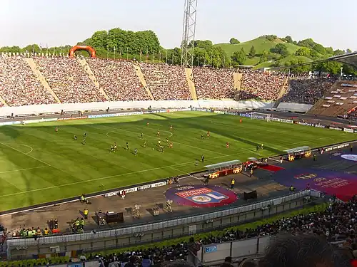 Die Südkurve etablierte sich als die Seite des Stadions, von der aus die Fans des FC Bayern ihre Mannschaft anfeuerten, während die Nordkurve die Seite der Anhänger des TSV 1860 wurde.[66] In den zuschauerreichsten Jahren kamen insgesamt bis zu 1,8 Millionen Zuschauer pro Saison in das Olympiastadion.[67]