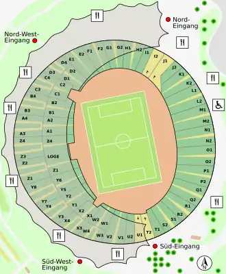 Dank der Konstruktion als Erdstadion betritt der Besucher das Stadion am oberen Rand und erhält dadurch einen raschen Überblick über den Raum und das Geschehen in der Arena.[126] Die Funktionsräume befinden sich in den Ebenen darunter, fast alle im Inneren der Westtribüne. Im Norden, Osten und Süden sind lediglich Toiletten unterhalb des Zugangsniveaus eingebaut. Sie sind durch den sogenannten WC-Ring, einen 600 Meter langen und ein Meter breiten Tunnel, miteinander verbunden.[144] Dieser beginnt unter Block X im südlichen Teil der Haupttribüne, verläuft unter der südlichen Anzeigetafel vorbei unter der Gegengeraden in der Nordkurve bis unter den Block C.[144] Der Tunnel verhilft dem Stadionpersonal, rasch von einem Ort zum anderen zu gelangen.[60]