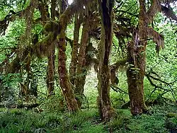 Die üppigen Wälder in den Tälern des Quinault, Queets, Hoh und Bogachiel River sind typische Beispiele für den urigen gemäßigten Regenwald. Dieser erstreckt sich vom Süden Oregons bis nach Südost-Alaska. Allerdings ist außerhalb der Schutzgebiete wenig davon erhalten. Hier fallen jährlich bis zu 4.000 mm Niederschlag, bei gemäßigter Temperatur, welche selbst im Sommer nicht über 27 Grad Celsius hinausgeht. Hier wachsen Epiphyten, Moose, Farne und Flechten auf den Baumstämmen und Ästen, welche dem Wald ein dschungelartiges Aussehen verleihen.