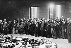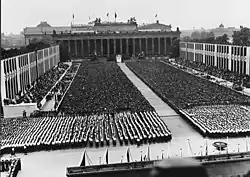 45 Minuten Deutsche Leibesübungen war eine sportliche Großveranstaltung am 9. August 1936 im Berliner Olympiastadion.[10][11][12] Insgesamt 4000 deutsche Turnerinnen und Turner vollführten am Vorabend der olympischen Turnwettkämpfe[13] ein Massen-Schauturnen.[14] Es wurden Freiübungen, Keulenschwingen und Ballspiele geboten. Die Präsentation integrierte u. a. eine „Körperschule“ der Männer, Gymnastik und Tänze von Frauen unter der Regie von Carl Loges.[15] Meisterturner aus Hamburg und Berlin zeigten u. a. Vorführungen an den Ringen. Die Hamburger Turner hatten sich in einem Ausscheidungsturnen am 6. Juli 1936 qualifiziert.[16] Außerdem zeigten der vierfache Olympiasieger von 1896 Carl Schuhmann und eine Altersriege drei Übungen.