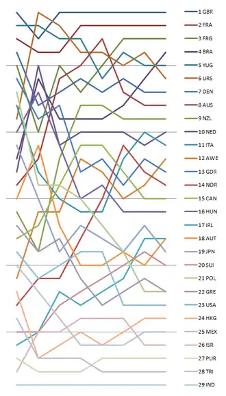| Rang | Land | Steuermann | Crew | Rennen I | Rennen II | Rennen III | Rennen IV | Rennen V | Rennen VI | Rennen VII | Punkte | ||||||||