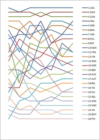 | Rang | Land | Steuermann | Crew | Rennen I | Rennen II | Rennen III | Rennen IV | Rennen V | Rennen VI | Punkte | |||||||