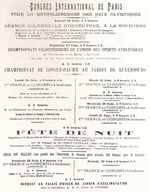 Geschickt hatte Coubertin als letzten von acht Programmpunkten la possibilité du rétablissement des jeux olympiques[10] (die Möglichkeit der Wiederbelebung von Olympischen Spielen) aufnehmen lassen. Zudem war er als Generalsekretär der USFSA mit der Organisation des Kongresses beauftragt worden. Dies ermöglichte ihm eine nicht unerhebliche Einflussnahme auf den Ablauf, bei dem nach seinem Willen das Hauptaugenmerk auf ebendieser Wiederbelebung der Olympischen Spiele liegen sollte.