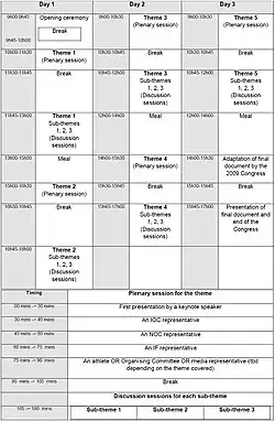 Für alle administrativen Aufgaben zur Durchführung des Kongresses werden vom IOC verschiedene Kommissionen und Komitees gebildet und entsprechende Regularien aufgestellt. Diese enthalten auch einen zeitlich genau geplanten Ablauf des Kongresses.[45]