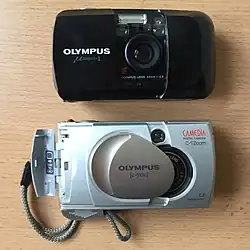 Mit der CAMEDIA (CAMERA DIGITAL) C-400 und C-400L stieg Olympus 1996 in die Kompaktklasse der Digitalkameras ein. Sie boten mit ihren 1⁄3-Zoll-CCD-Sensoren eine Auflösung von 640 × 480 Pixeln und besaßen ein 36-mm-Objektiv (bezogen auf 35-mm-Kameras).[25] 2003 erschien die µ-10 DIGITAL. Die geschwungenen Linien ihres wetterfesten Metallgehäuses hatte sie von ihren analogen Vorgängerinnen übernommen. Das Design der µ-Digitalkameras hat sich im Laufe der Jahre teilweise gewandelt, geblieben ist aber ihre Popularität dank ihrer nach wie vor einfachen Handhabung. Alle Kameras haben ein wetterfestes Gehäuse. Die µ-tough-(SW)-Modelle sind sogar zwischen drei und zehn Meter wasserdicht und außerdem stoßfest. Die SP-Serie mit den UltraZoom-Kameras bietet starke Tele- beziehungsweise Weitwinkel-Teleobjektive.[26]