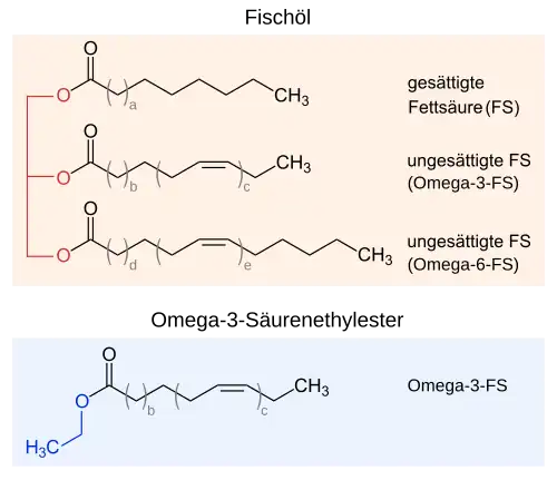 Vergleich der chemischen Strukturen von Fischöl und Omega-3-Säurenethylester. Oben: Grundstrukturen der in Fischöl enthaltenen Triglyceride: Glycerin (braun) ist mit unterschiedlichen gesättigten und ungesättigten Fettsäuren (FS) verestert. Bei mehrfach ungesättigten FS ist c bzw. e größer als Eins. Je nach Lokalisation der ersten Doppelbindung vom Omega-Ende aus gesehen unterscheidet man ungesättigte FS in „Omega-3-Säuren“, „Omega-6-Säuren“ und so weiter. Unten: Strukturen der in Omega-3-Säurenethylester enthaltenen Komponenten, hauptsächlich die Ethylester (Ethanolkomponente: blau) der EPA (b=1, c=5) und DHA (b=0, c=6)
