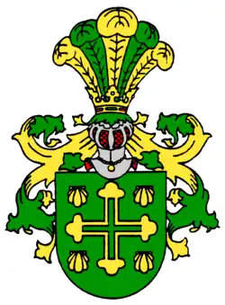 Das Wappen von 1896 zeigt in Grün ein von vier goldenen Jakobsmuscheln bewinkeltes, durchbrochenes goldenes Lilienkreuz. Auf dem Helm mit grün–goldenen Helmdecken fünf abwechseln goldene und grüne Straußenfedern.