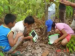 OLPC-Projektschule in Ban Samkha, Thailand: Die Kinder dokumentieren mittels eingebauter Kamera (B4-Prototyp) einen Pflanzenfund während eines Schulausflugs.