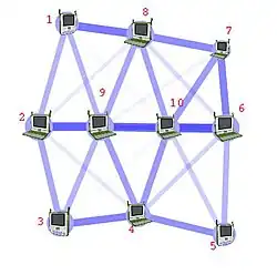 Funknetzwerk gem. IEEE 802.11s: Jeder Laptop ist in der Lage Datenpakete weiterzuleiten und damit eine Informationskette zu bilden.
