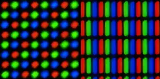 Ver­gleich der XO-1-Anzeige (links) mit einem üb­lich­en TFT-LCD. Die Bil­der zeigen jeweils eine Fläche von 1×1 mm. Je drei Sub­pixel der üb­lich­en Anzeige (rechts die eines Lenovo X61) werden gemein­hin als ein Pixel bezeichnet, wäh­rend beim OLPC-XO-LCD jedes Sub­pixel als eigen­es Pixel gilt.