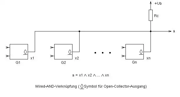 Die Ausgangsspannung Ua befindet sich bei positiver Logik nur dann im HIGH-Zustand, wenn alle angeschlossenen Gatterausgänge ebenfalls High sind, d. h., alle Ausgangsstufen sperren. Andererseits erkennt man, dass die Ausgangsspannung in den LOW-Zustand geht, wenn auch nur ein Ausgang sich im LOW-Zustand befindet. Damit ergibt sich für positive Logik eine UND-Verknüpfung der Ausgänge.