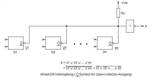 Man erkennt, dass die UND-Verknüpfung der negierten Gatterausgänge mit nachfolgender Negation eine ODER-Verknüpfung liefert. WIRED-AND- und WIRED-OR-Strukturen werden z. B. bei der Implementierung von programmable logic arrays (PLA) eingesetzt.