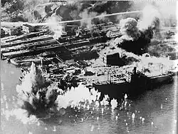 ![]() Eine Curtiss SB2C Helldiver über einem brennenden japanischen Tanker nahe der Küste Vietnams | |||||||||||||||