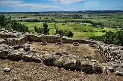 Die Siloterrasse bildet das erste erkennbare archäologische Ensemble rechts der ansteigenden Zufahrtsstraße, kurz vor dem Parkplatz, nahe dem Eingang zum Siedlungsgelände. (B, Station 1)