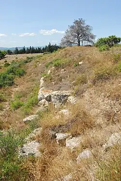 Kaum einen Kilometer weiter abwärts kreuzt die Zufahrt die antike Römerstraße Via Domitia, die von Nordosten nach Südwesten an der Ostflanke des Hügels vorbei und dort ein kurzes Stück über einen kleinen Pass führte.