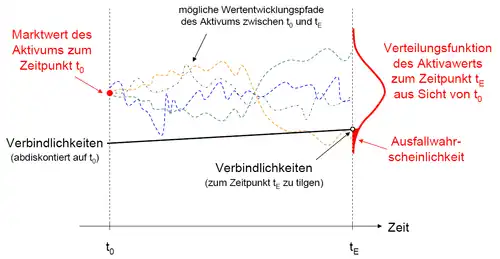 Ferner wird angenommen, dass das Unternehmen Fremdverbindlichkeiten aufgenommen hat und diese zum Zeitpunkt zurückzahlen muss. Falls der Wert der Aktiva, , zu diesem Zeitpunkt () niedriger ist als die zu bedienenden Verbindlichkeiten des Unternehmens, so ist das Unternehmen zahlungsunfähig und fällt damit an die Gläubiger, da die nicht nachschusspflichtigen Eigentümer des Unternehmens keinen Anreiz haben, den Gläubigern den Fehlbetrag aus ihrem Privatvermögen zu erstatten.[9] Eine persönliche Bindung der Eigentümer an das Unternehmen oder sonstige subjektive Bewertungsunterschiede aufgrund unterschiedlicher Präferenzen, Informationen oder Erwartungen wird ausgeschlossen.