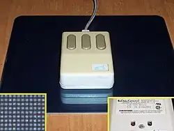 Eine optische Maus ist ein seit 1987[1] erhältliches Zeigegerät in der Informationstechnologie. Diese Art der Computer-Maus strahlt nach unten Licht aus und eine kleine Sensorchip-Kamera tastet mehrere hundert Bilder pro Sekunde ab, woraus eine in der Maus integrierte Recheneinheit mit Verfahren der Bildverarbeitung die Bildverschiebung ermittelt und somit die Bewegung der Maus. Die früher üblichen mechanischen Mäuse verwenden hingegen eine Rollkugel, deren X- und Y-Rotation über zwei Rollen abgenommen werden und jeweils über eine Schlitzscheibe eine Lichtschranke unterbrechen.