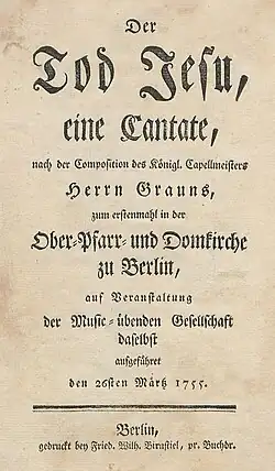Während Bachs Passionen die barocke Oratorientradition mit einem letzten Höhepunkt abschließen, zeigt sich in einem anderen beliebten Werk der damaligen Zeit ein Oratorientypus, der in der Folgezeit vorherrschend werden sollte: in Carl Heinrich Grauns Vertonung eines Passionslibrettos von Karl Wilhelm Ramler, Der Tod Jesu (1755; später ebenfalls vertont von Georg Philipp Telemann und von Joseph Martin Kraus). Später folgen zwei weitere Oratorienlibretti Ramlers: Die Hirten bei der Krippe zu Bethlehem (1758; vertont u. a. von Johann Friedrich Agricola) und Die Auferstehung und Himmelfahrt Jesu (1760; vertont u. a. von Georg Philipp Telemann und Carl Philipp Emanuel Bach). Literarhistorisch und ästhetisch gehören diese Oratorien in den Umkreis der (vorklassischen) Empfindsamkeit, auch wenn sich – anders als kurze Zeit später bei Georg Friedrich Händels Messias – direkte Einflüsse Klopstocks nicht finden. Grauns Tod Jesu hatte bei seinem Erscheinen überaus großen Erfolg und wurde häufig aufgeführt; in Berlin sogar fast jährlich bis 1858 und noch einmal von 1866 bis 1884.