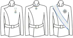 Das Großkreuz wurde mit einer Schärpe über die rechte Schulter zur linken Hüfte und mit einem achtstrahligen Bruststern getragen. Kommandeure trugen einen Halsorden, Ritter den Orden am Band.