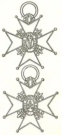 Die Ordensdekoration bestand aus einem goldgefassten rot emaillierten achtspitzigen Kreuz mit Goldkugeln an den jeweiligen zwei Kreuzarmspitzen. In den Kreuzarmwinkeln waren je eine goldene Lilie. Ein auf dem Kreuz aufliegendes Medaillon war blau und zeigte vorn den heiligen Johannes von einem weißen Ring mit der Ordensdevise Praemium virtutis et pietatis (Preis der Tugend und Frömmigkeit) umgeben. Die Rückseite hatte die Umschrift Ordine Institutio MDLX (Der Stiftung des Ordens 1560) und mittig im Medaillon waren unter der Tiara die Schlüssel Petri.