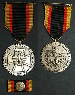 Nach Kriegsende verbot Art. IV des Kontrollratsgesetzes Nr. 8 vom 30. November 1945 das Tragen, Verleihen und Annehmen sämtlicher militärischer und ziviler Orden, Ehrenzeichen und Auszeichnungen jeder Art.[64] Gelockert wurde das Verbot mit dem Gesetz Nr. 7 der Alliierten Hohen Kommission vom 21. September 1949. Die Beschränkungen für die Stiftung und Verleihung neuer Auszeichnungen entfielen. Verboten blieb jedoch das Tragen sämtlicher Orden, Ehrenzeichen, Abzeichen und Rangabzeichen der ehemaligen deutschen Wehrmacht, der NSDAP sowie aller angegliederten oder unterstellten Organisationen, wobei die Besatzungsmächte unter Berufung auf den Wortlaut des maßgeblichen englischen (former german armed forces) bzw. französischen (anciennes forces armées allemandes) Textes unter „deutsche Wehrmacht“ alle früheren deutschen bewaffneten Kräfte verstanden. Infolge dieser Auslegung war faktisch auch das Tragen von Auszeichnungen und Abzeichen aus dem Ersten Weltkrieg verboten. Dieses Verbot blieb auch über das Ende des Besatzungsstatuts hinaus gültig, da gemäß der Pariser Verträge vom 23. Oktober 1954 die von den Besatzungsbehörden erlassenen Rechtsvorschriften „solange in Kraft bleiben, bis sie von dem nunmehr zuständigen deutschen Gesetzgeber aufgehoben werden“.[65]
