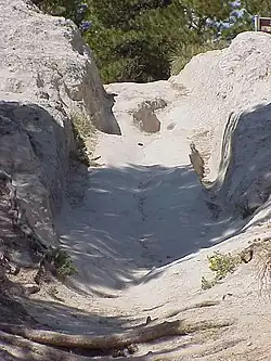 Oregon Trail Ruts in Wyoming, eine National Historic Landmark, wo man die Spuren der Pferde und der Wagenräder noch im Sandstein erkennen kann