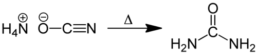Im Jahr 1828 erhitzte Friedrich Wöhler Ammoniumcyanat und erhielt einen ganz andersartigen Stoff, den Harnstoff.[11] Ausgangsprodukt und Endprodukt haben die gleiche chemische Summenformel (Isomerie), sie besitzen jedoch sehr unterschiedliche Eigenschaften: das Ammoniumcyanat ist eine anorganische Verbindung, der Harnstoff ist eine organische Verbindung. Damit war die Hypothese von Berzelius, dass organische Verbindungen nur durch eine besondere Lebenskraft entstehen können, widerlegt.