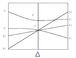 Für Ionen mit der Konfigurationen d2, d3, d7 oder d8 ergibt sich im P- und F-Orgel-Diagramm, dass sich der F-Grundterm in einen T2(g)-, T1(g)- und einen A2(g)-Term aufspaltet, während sich der P-Grundterm in einen T1(g)-Term umwandelt. Mit steigender Feldstärke, also ausgehend von der Mitte des Diagramms hin zu einer der beiden Seiten nimmt auch hier deren energetischer Abstand zu. Links im Diagramm finden sich hier die d2- oder d7-Tetraeder und die d3- und d8-Oktaeder, entsprechend findet sich rechts im Diagramm die d3- oder d8-Tetraeder und die d2- und d7-Oktaeder.[1][2]