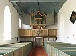 Ursprünglich stand das Instrument auf einem Lettner im Chorraum. Für die Errichtung einer Orgel bestand im ausgehenden Mittelalter keine musikalische Notwendigkeit, da ihr keine tragende Bedeutung in der Liturgie zukam und sie vor dem 17. Jahrhundert nicht zur Begleitung des Gemeindegesangs eingesetzt wurde. Stattdessen erfüllte sie für die führenden Vertreter des agrarischen Gemeinwesens, die den Bau finanziert hatten, eine repräsentative Funktion und gehörte „in ein Klima zugleich intensivierter Frömmigkeit wie einem wachsenden Selbstbewusstsein der Kirchenglieder gegenüber dem Klerus.“[7] Wann genau das Werk auf die Westempore umgesetzt wurde, ist unklar.