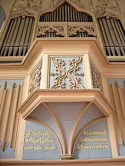 Der flach gestaltete Prospekt ist vierachsig nach dem Goldenen Schnitt konstruiert und mit gotischem Schnitzwerk verziert. Das reich profilierte Untergehäuse ist in drei Felder gegliedert, in deren beiden äußeren je drei Registerzüge angebracht sind. Das Motiv einer Sanduhr hinter den Registertafeln steht symbolisch für die Vergänglichkeit, während die gemalten Gestirne auf den Flügeltüren die himmlische Dimension darstellen.[23] Die Bleipfeifen im Prospekt sind mit einer glänzenden Zinnfolie überzogen. Die äußeren beiden Pfeifenfelder mit je sieben Pfeifen enden in spätgotischen Kielbögen. Wegen der Symmetrie wurde im rechten Bassfeld eine stumme Pfeife eingebaut. Die beiden inneren Felder mit je 14 Pfeifen sind rechteckig und werden von einem Mittelfeld mit stummen Pfeifenattrappen überspannt, das ebenfalls von einem Kielbogen abgeschlossen wird. In diesem Feld könnten die 15 Pfeifen der beiden Oktavregister, die eine andere Bauweise als das Prinzipalregister aufweisen, ursprünglich als klingende Pfeifen gestanden haben.[24]