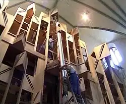 Aufbau der neuen OrgelEinsetzen der Orgelpfeifen in das fertiggestellte GehäuseBlick auf die Orgel von der Empore